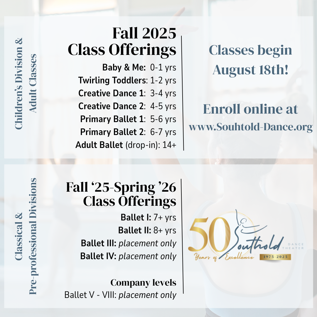 If your dancer is new to Southold and you would like to register them for one of our classes, please use the links below or call our office to schedule an audition or placement class at (574) 233-9841 or email us at admin@southolddance.org.